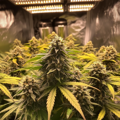 Plants grow to a medium height with a thick central cola and strong lateral branches, making them suitable for tight indoor setups or discreet outdoor cultivation. The full lifecycle completes in just 9 to 10 weeks from seed, yielding dense, frosty buds with minimal leaf content.